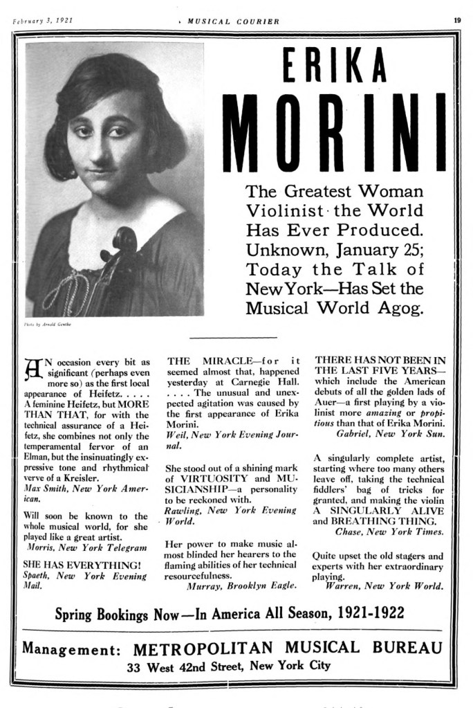 The copy of the Musical Courier (“Weekly Review of the World’s Music”) in Erika’s hands could be the one containing the advertorial from her tour management reproduced below. A search of the magazine’s archive online in the period of the American tour reveals a strikingly modern approach to PR and its attendant hype. There’s the fake news of reports from the Viennese press that Morini was getting paid $6,000 per concert; the cringeworthy interview asking about boyfriends.