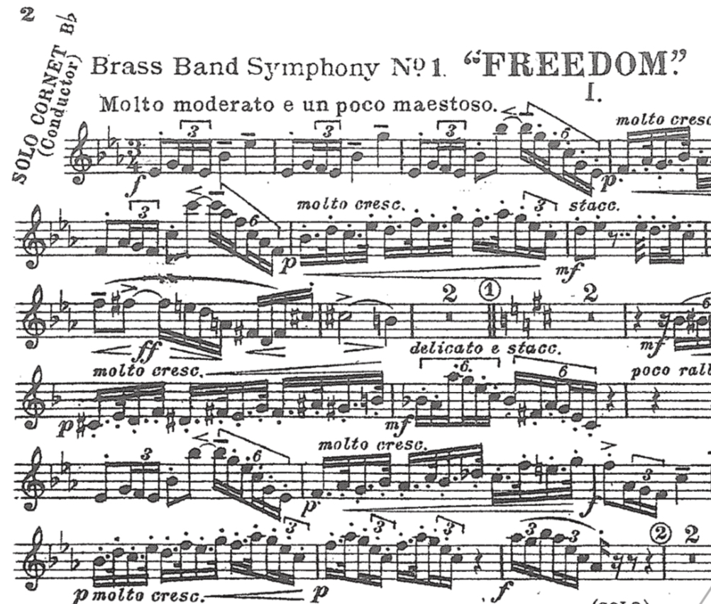 Hubert Bath’s Freedom (Brass Band Symphony No.1) was representative of a new style of competition test piece. Before the war, the set work usually consisted of an arrangement of a well-known orchestral piece, such as the William Tell Overture. But as standards of playing got higher and higher, contemporary composers were commissioned to write new, ever more challenging pieces, a tradition that continues to this day. (For a more recent example of mind-blowing virtuosity, have a listen to Philip Wilby’s Masquerade.)