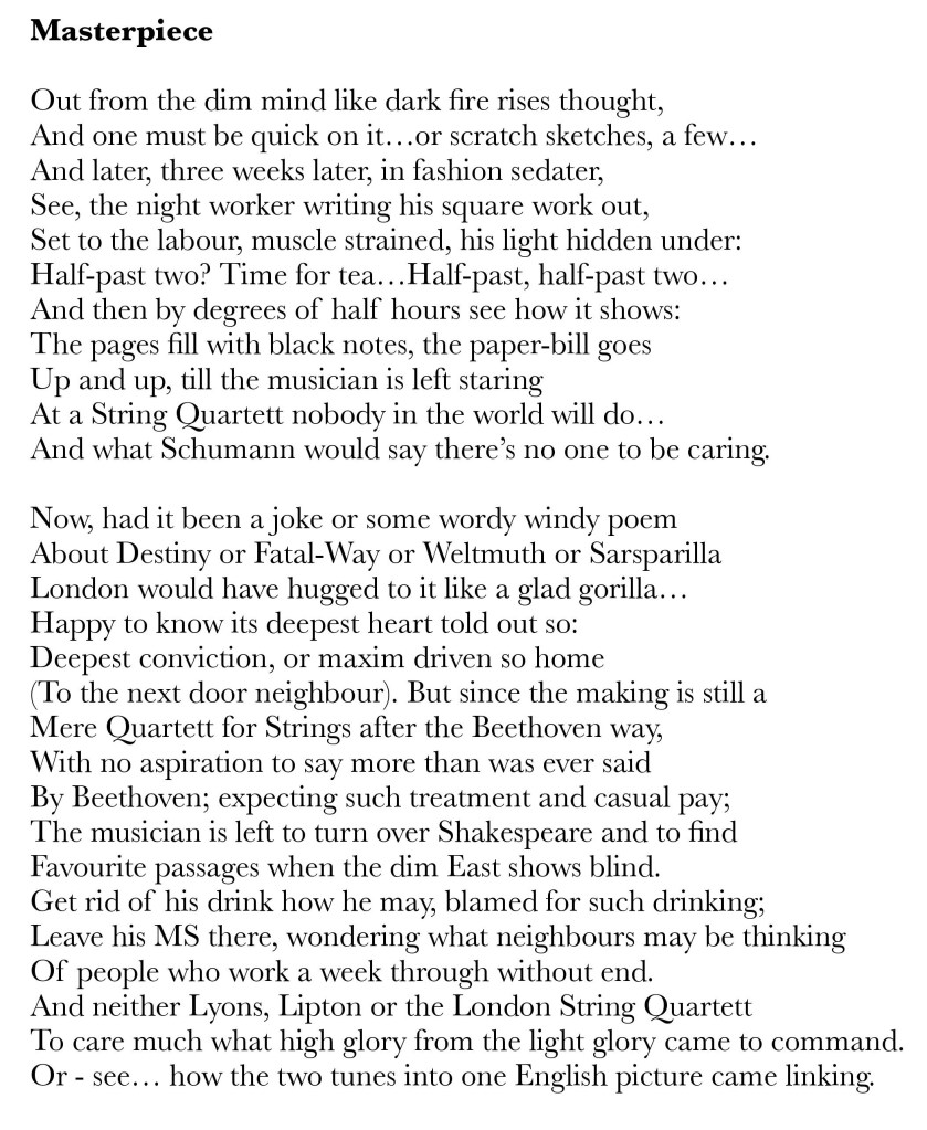 Gurney continued to write music and poetry and, though justly famous for his war poetry and evocations of his beloved Gloucestershire (the title of his first published collection, Severn and Somme, sums this up), he also gives us occasional glimpses into his everyday life. One such poem is Masterpiece – a fascinating insight into the composition of a string quartet in a fairly lighthearted tone (the title is surely tongue-in-cheek) – in which he links poetry and music: two equally important art forms for Gurney. The poem has been dated to November-December 1924: Gurney marked the manuscript “27th month” (i.e. of incarceration).